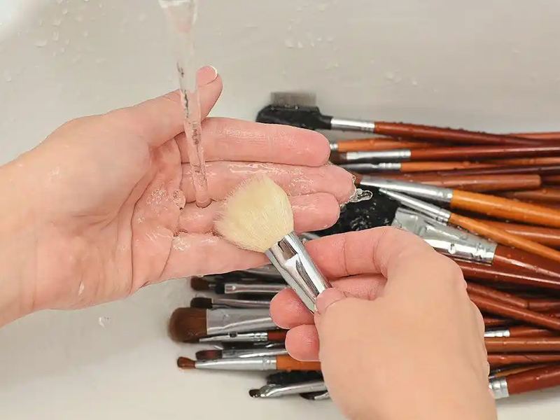 Huelt de Makeup Pinsel eraus a rëselt d'Feuchtigkeit. Wann net grëndlech gebotzt, widderhuelen den éischte Schrëtt.
